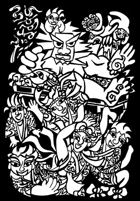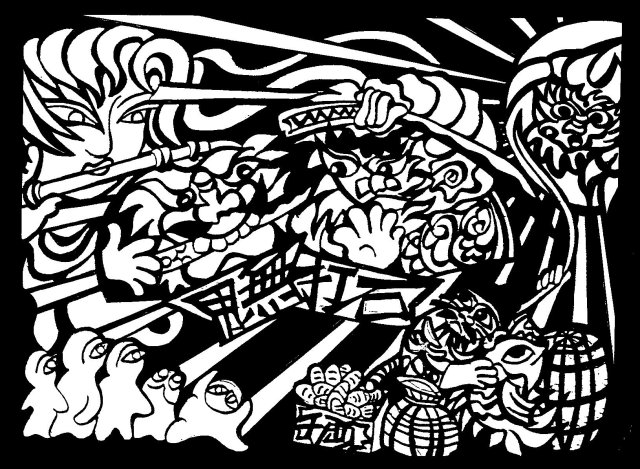 <必殺ねぷた疾走之図>は、2003年.弘前での必殺ねぷた人という集団が出したねぷた[連獅子]に大いに感銘をうけて制作したもの。今まで自分が見た中での最高のねぷたであった。